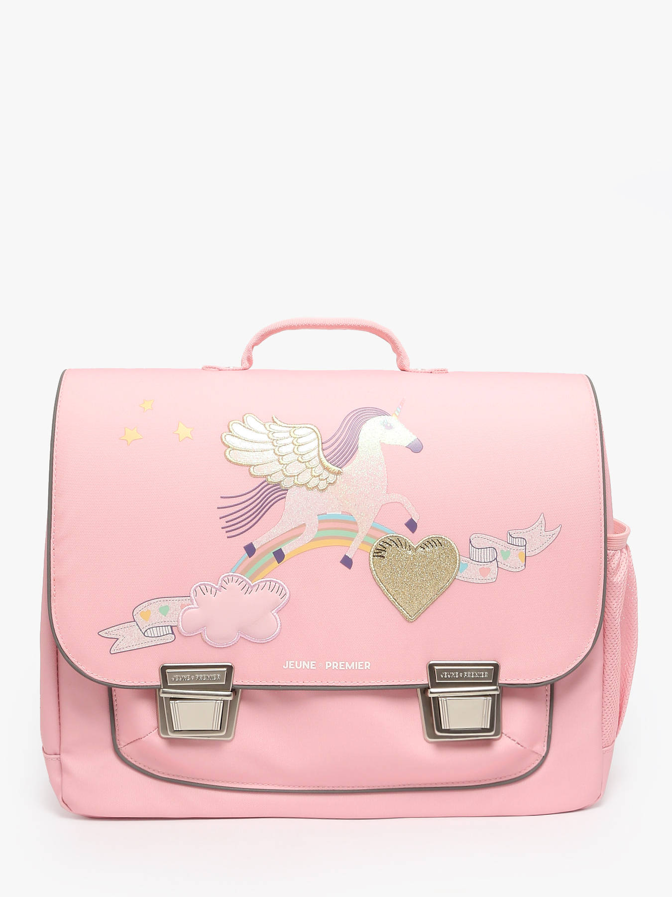 38 cm - 17.1 liters - 1.1 kg ~ This JEUNE PREMIER 2-compartment schoolbag is perfect for boys and girls aged 6 to 8. Made of durable polyester, it ensures both comfort and functionality throughout the school day. On the outside, it includes a handy front pocket, a side slot for a water bottle or small items, and a secure clasp under the flap for easy closure. Adjustable straps and a top handle offer ergonomic carrying on the back or by hand. Inside, it features two spacious compartments and a zipped pocket, and fits an A4 folder, 24x32 cm notebook, and A4 binder.