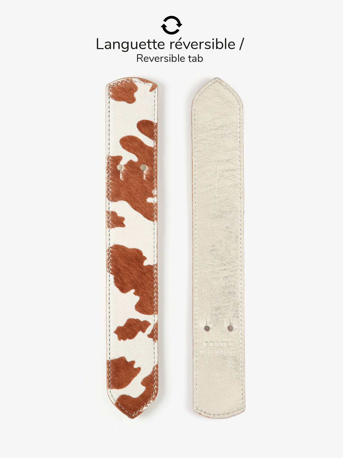 Personalize your Agnès bag with elegance thanks to the ETRIER statement tab. Reversible and crafted in France, it features the signature ETRIER embossed finish. One side showcases animal-print hair-on leather, while the other is crafted in gold leather—allowing you to switch styles effortlessly based on your mood. Available in four on-trend motifs (cow, cheetah, leopard, and zebra), it adds a unique and distinctive touch to your bag while expressing your personality.