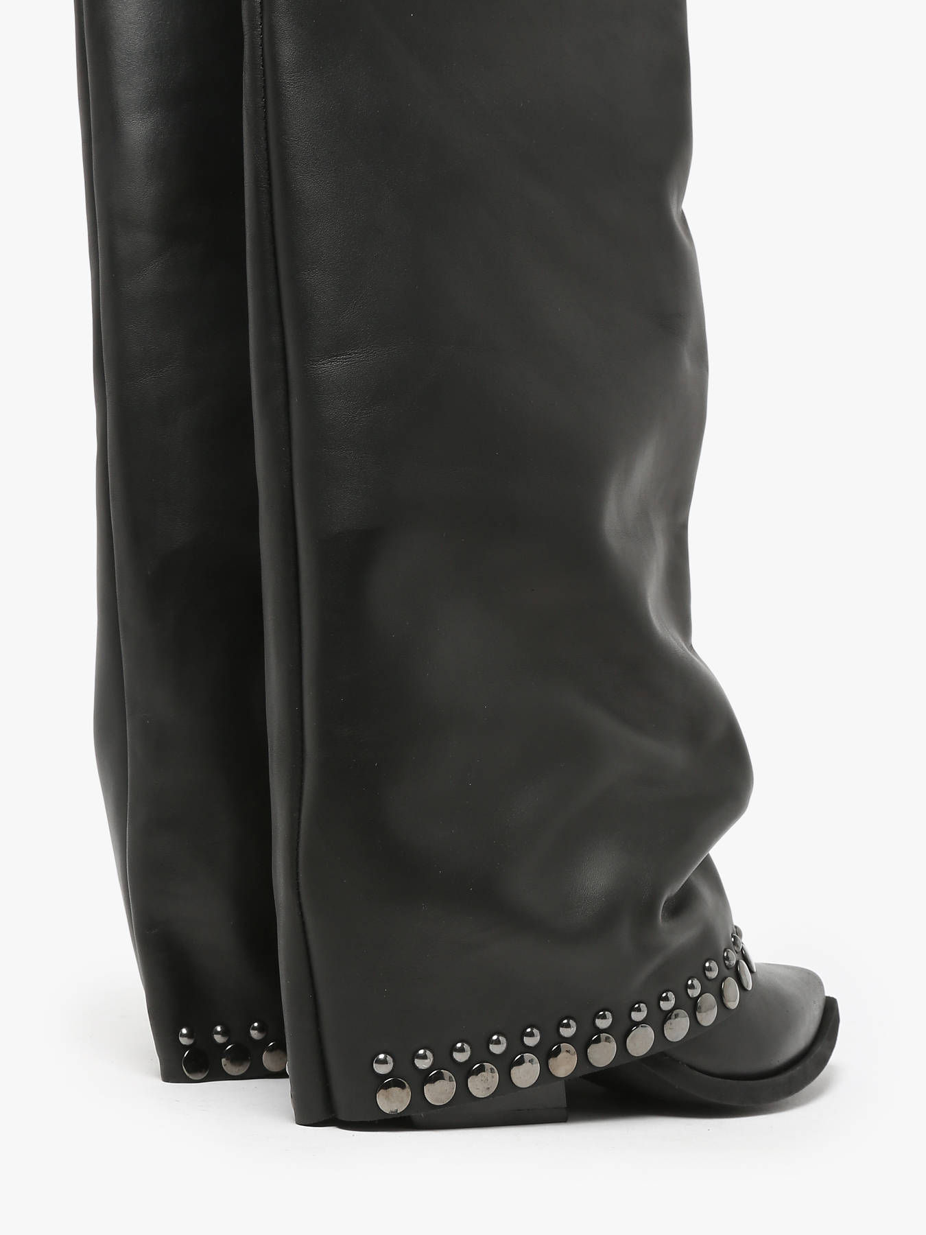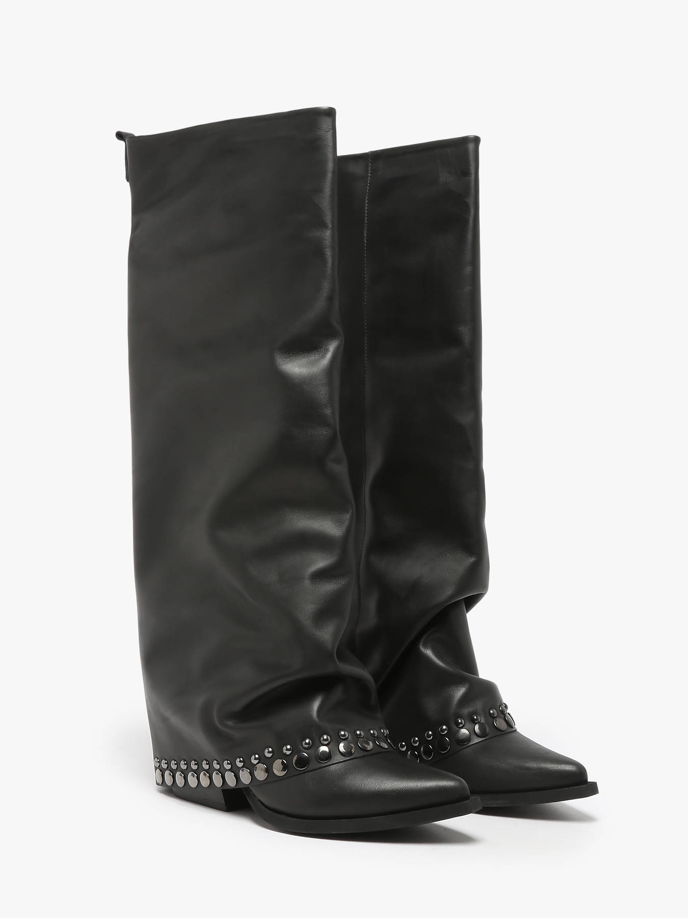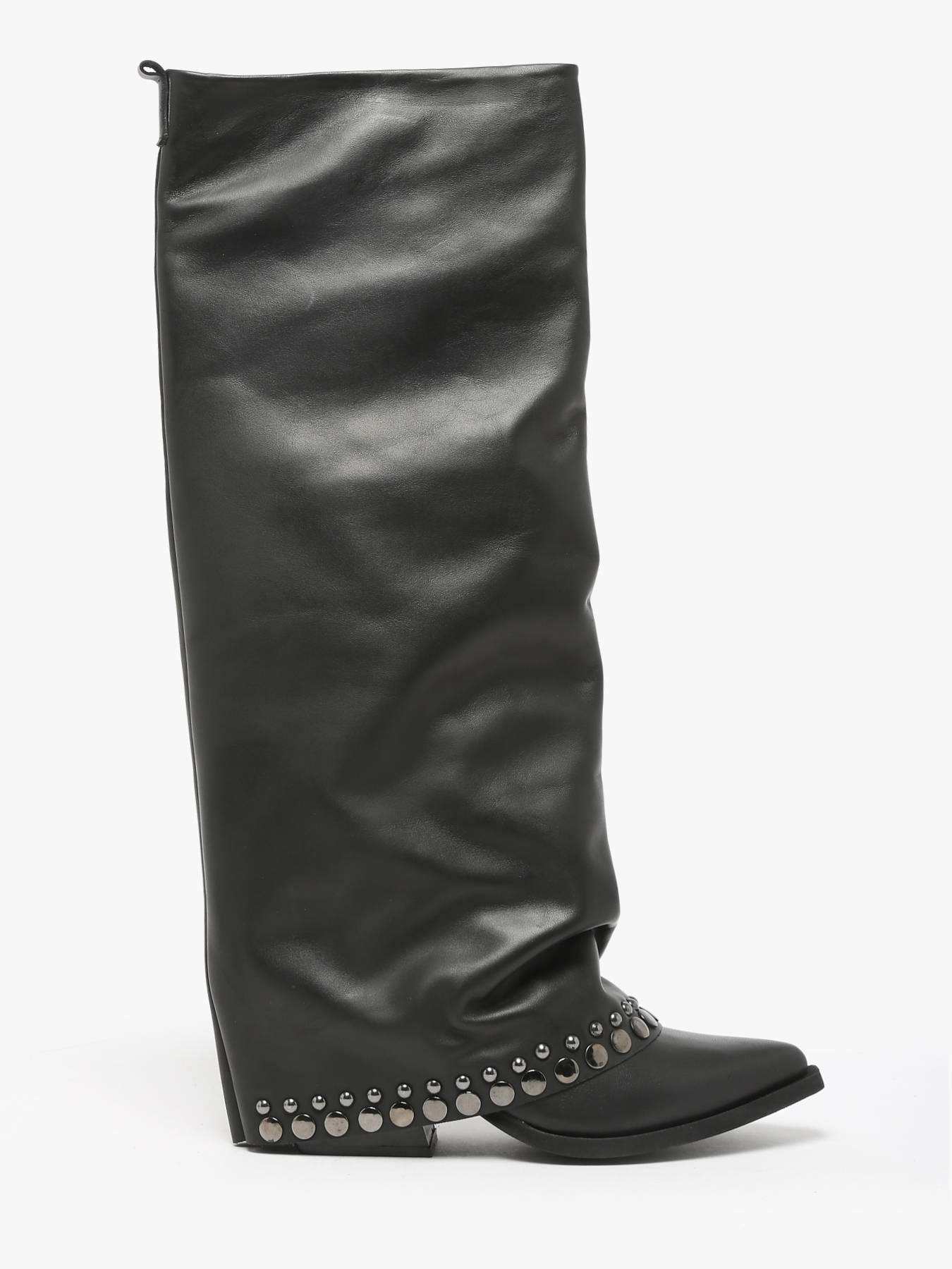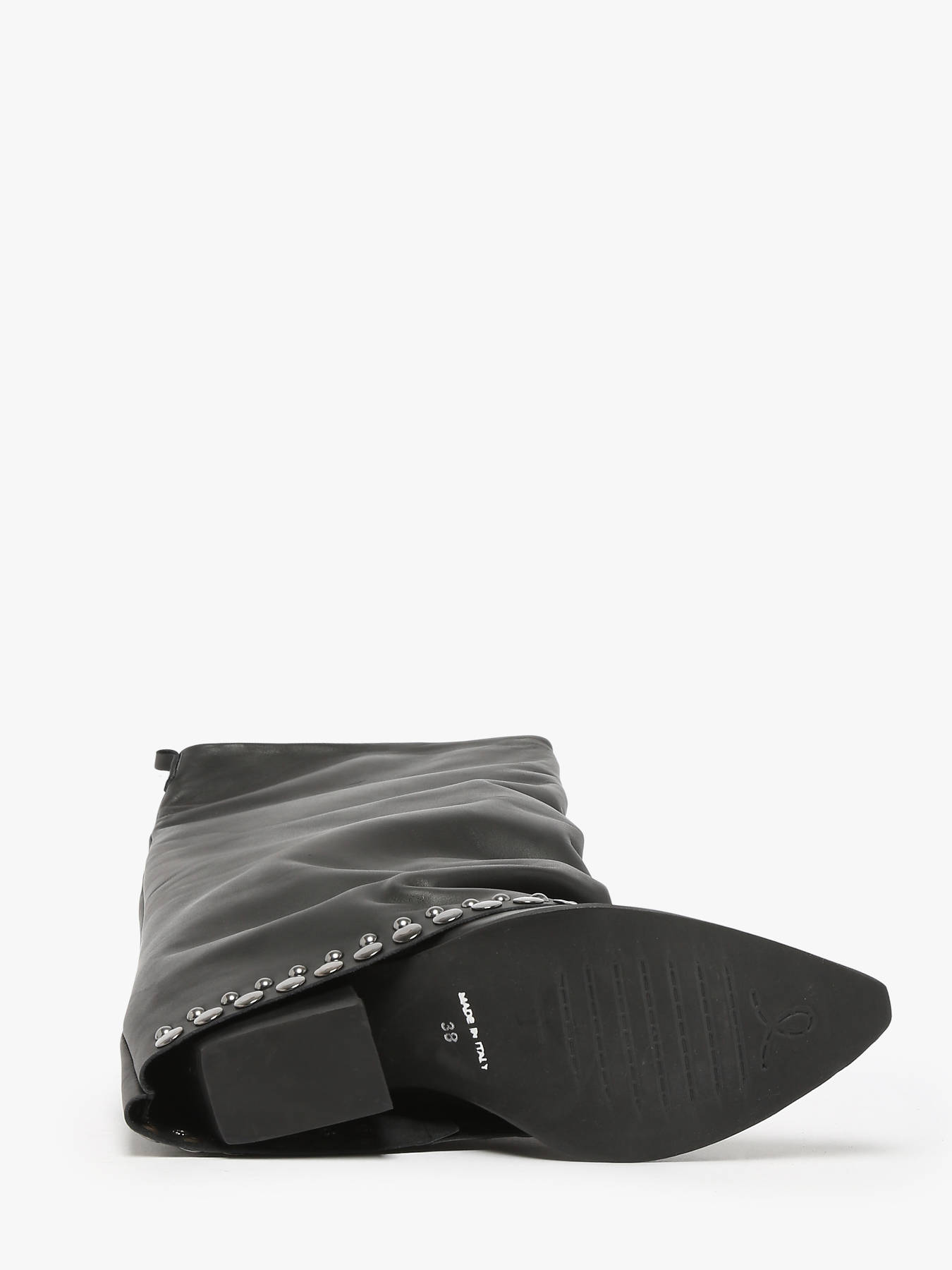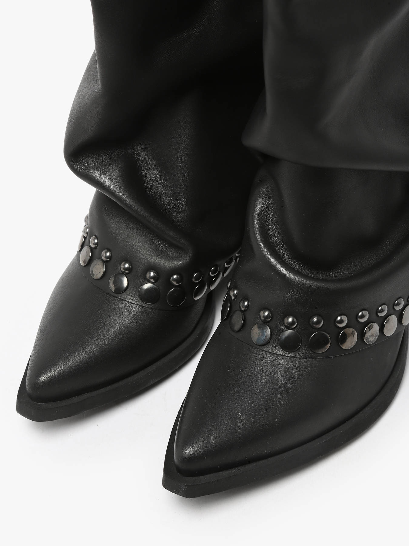 These N°6 leather slouchy cowboy boots, made in Italy, embody the latest autumn-winter trends. Stylish and bold, they feature studded details and a 7 cm angled heel. Their pointed toe and chic finish capture the spirit of the Wild West while adding a touch of femininity and elegance. Perfect for a modern and refined cowboy-inspired look, these boots are crafted for comfort and durability with a leather and synthetic lining. A must-have for enhancing any sophisticated and trendy outfit.