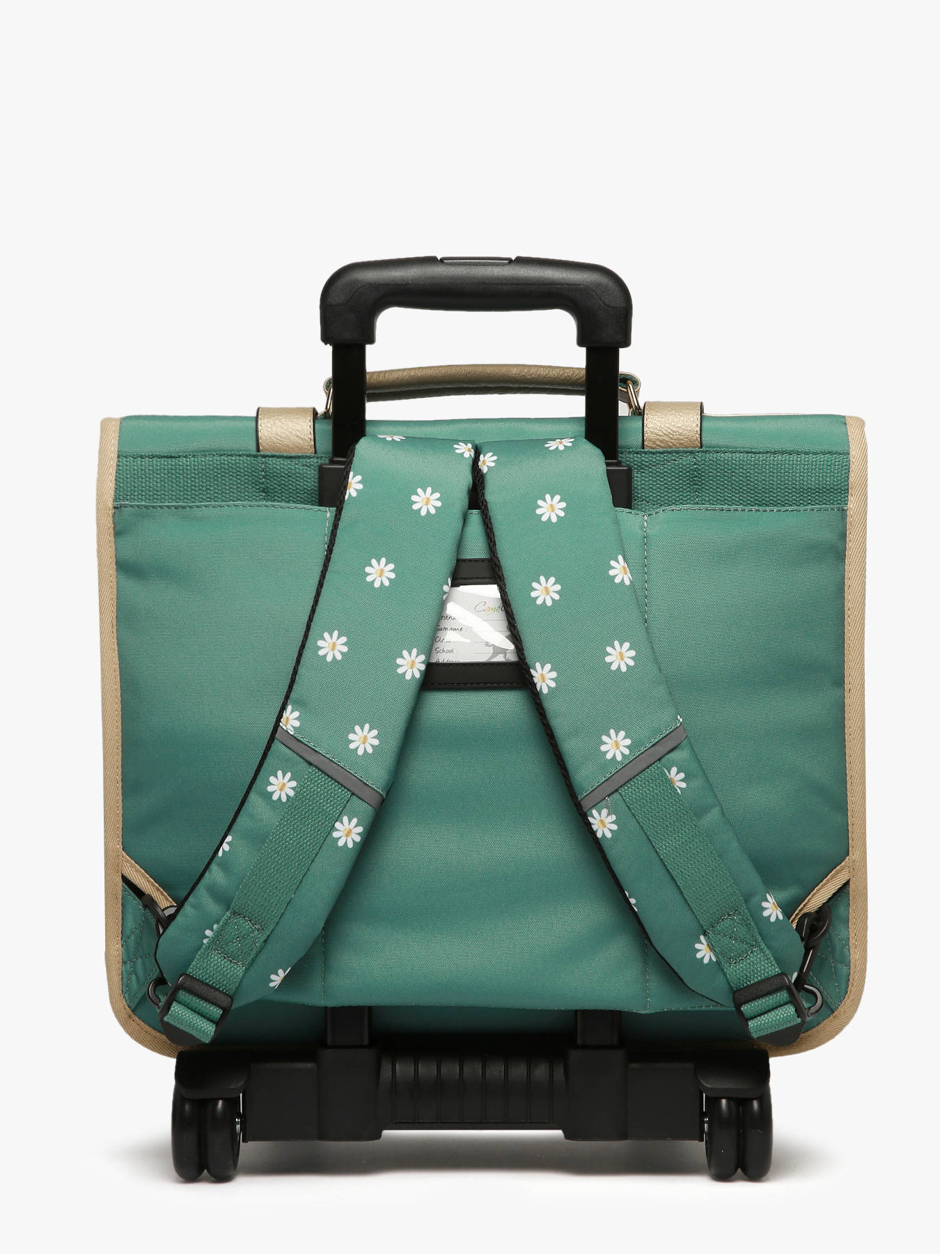 0.9 kg ~ Ce cartable à roulettes 3 compartiments 41cm de la ligne Vintage Fantasy de chez Caméléon est idéal pour le CM1 et le CM2. On aime ce cartable pour son grand espace, il se compose de trois compartiments permettant d’y glisser des cahiers ainsi que des classeurs allant jusqu’à 32x29x7cm. Il se compose également d’une poche intérieure zippée. À l’extérieur, il se compose de deux poches à fermeture éclair sur le devant ainsi que d’un porte gourde sur le côté. Une bande réfléchissante est présente sur l’avant afin de garantir la sécurité de votre enfant. Son fond ainsi que ses côtés sont renforcés, permettant une utilisation quotidienne. Il est aussi possible de l'utiliser en sac à dos grâce aux bretelles déclipsables qui se trouvent dans la poche arrière du sac et à la protection rembourrée au niveau de l'armature des roues pour protéger le dos de votre enfant. Afin de garantir un maintien optimal, les bretelles et le dos de ce cartable sont rembourrés. Petit plus, il dispose d’une étiquette nom, d’une règle offerte et de son porte-clé caméléon sur la poignée !