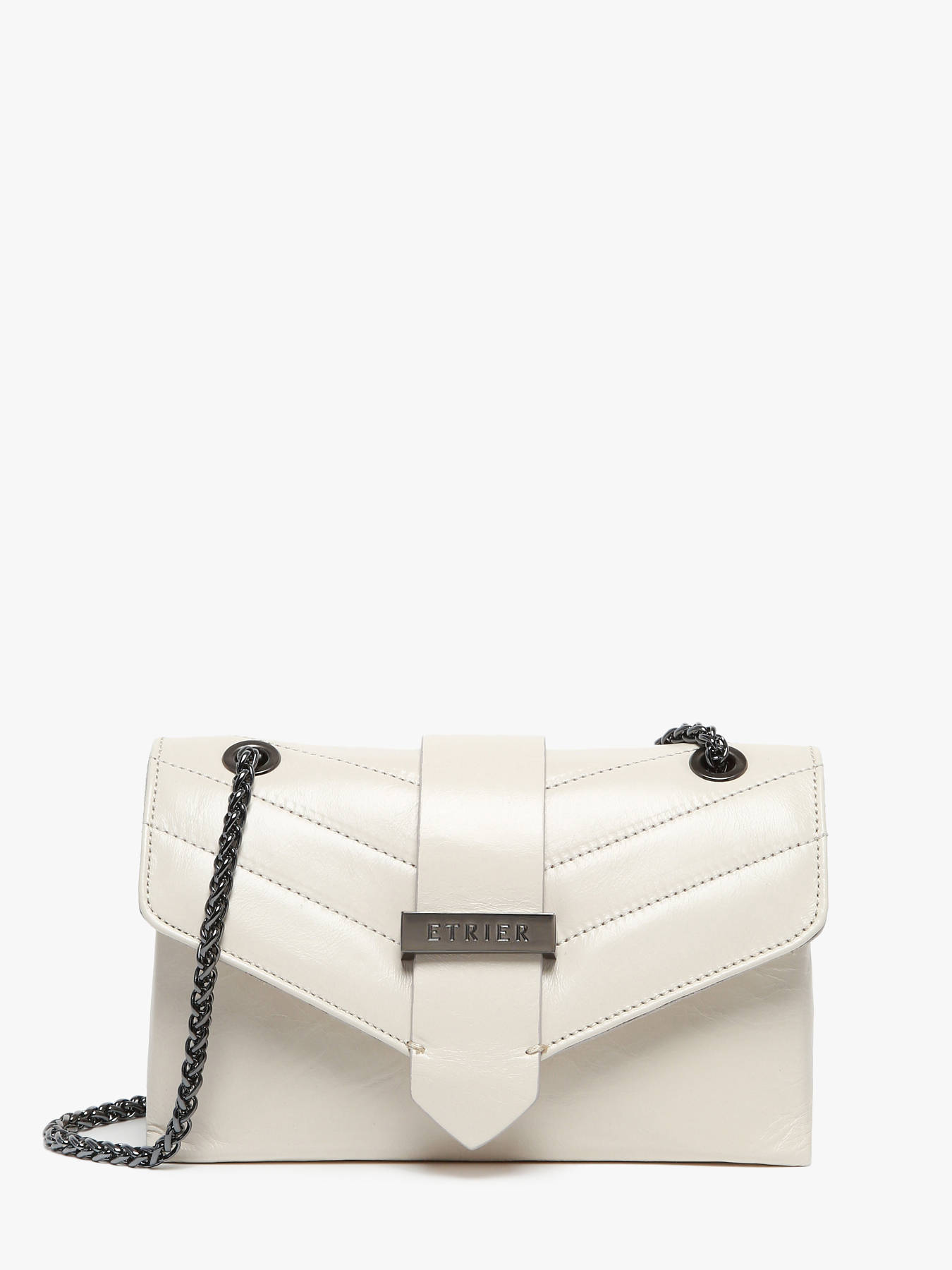 The ETRIER JANA AMOUR crossbody bag is available in two sizes, presented here in its mini version. Offered in new seasonal colors, this beloved model has been crafted in Italy. Its slightly shiny leather with a crackled effect and quilted design adds uniqueness to this handbag. Made of cowhide leather, it closes with a flap secured by a magnetic snap. Featuring a chain and leather shoulder strap, it can be worn crossbody or over the shoulder. Inside, two compartments accommodate a slip pocket and a zip pocket, all lined with cotton for a polished finish.