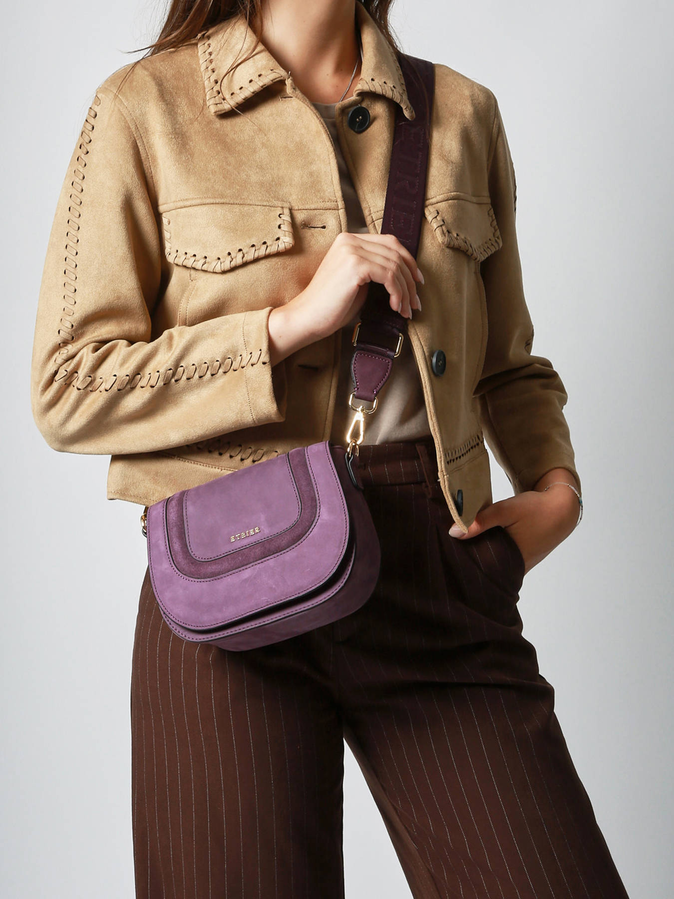 The ETRIER crossbody bag from the LASSO line, in a small S size, closes with a magnetic flap combined with a zipper. The LASSO line stands out with its two-tone design featuring rounded details, offering a beautiful contrast of textures in a more compact volume. The back of the bag is made of grained leather, ensuring durability and structure. Its sporty-chic shoulder strap, enhanced with the ETRIER hardware, gives a modern and refined look. This structured and elegant bag is perfect for adding character to more understated winter outfits.