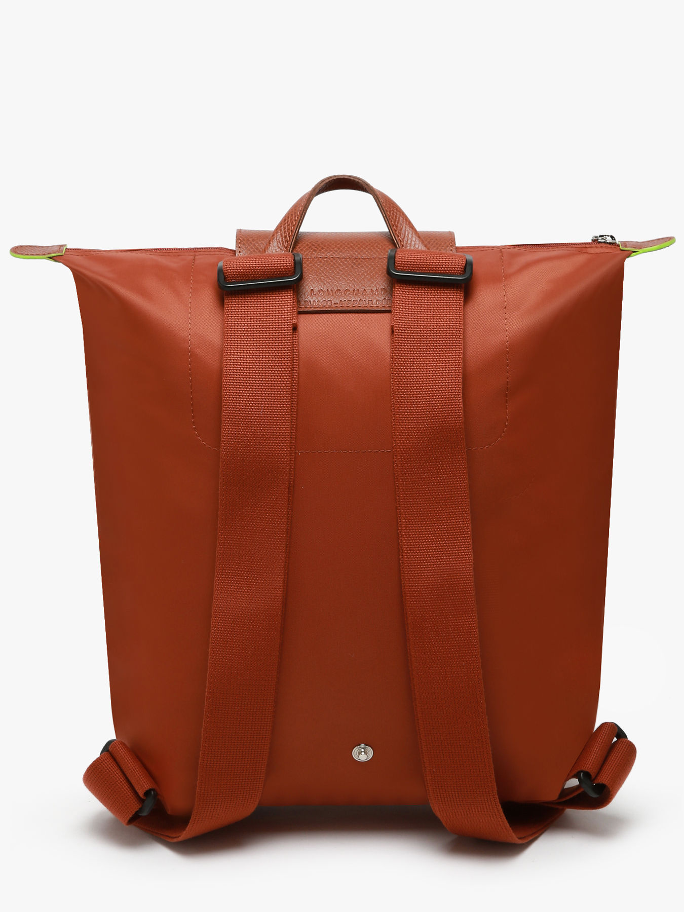The M Le Pliage backpack from Longchamp combines lightness, practicality, and environmental responsibility. Made from recycled nylon and leather trim, this backpack features a zip closure, a flap with a press stud, and adjustable straps for optimal comfort. Its spacious design accommodates a 16-inch laptop and other essentials, while its tonal color palette and the embroidered Longchamp horse add an elegant and modern touch. Lightweight and foldable, this bag embodies the dynamic and creative spirit of the brand. The Pliage Green line is an eco-friendly model, featuring a polyamide fabric certified GRS 4.0, ensuring durability and respect for natural resources. The green edge dyeing and leather trim highlight Longchamp's unique style and ecological commitment, offering a chic, responsible look.