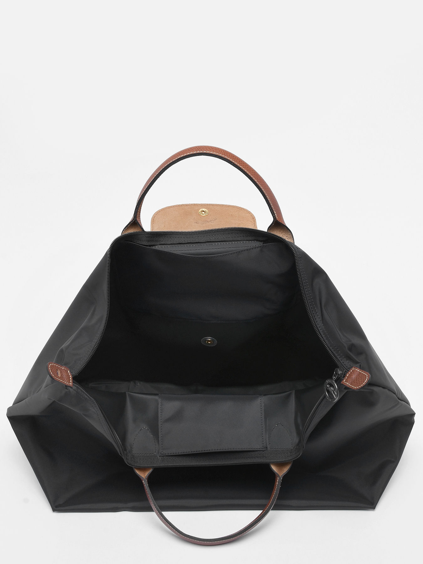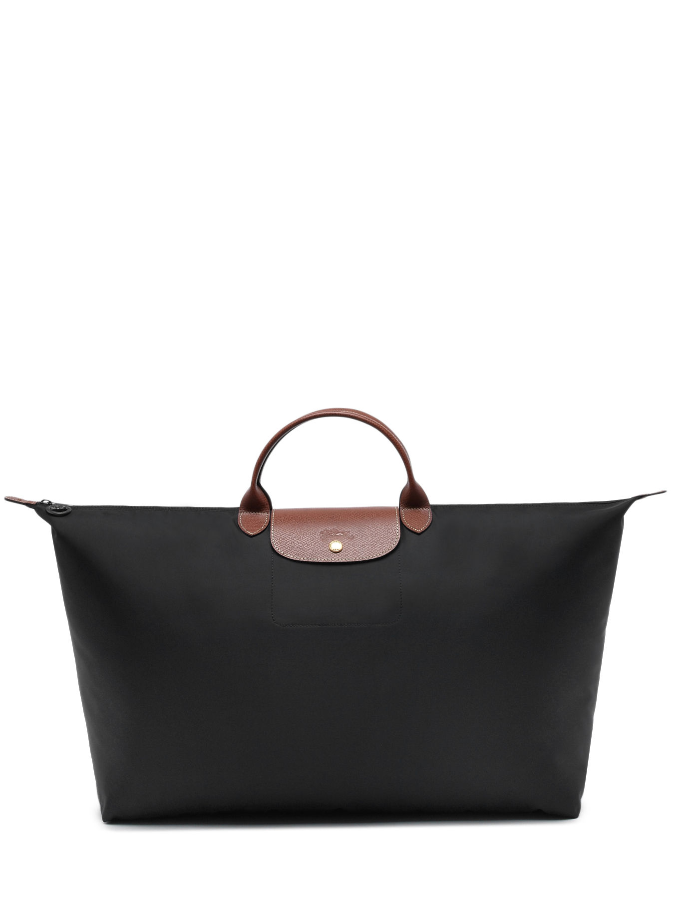 Fermez ce sac de voyage Le Pliage Longchamp à l'aide d'un zip ainsi que d'un rabat à pression et portez-le à la main.