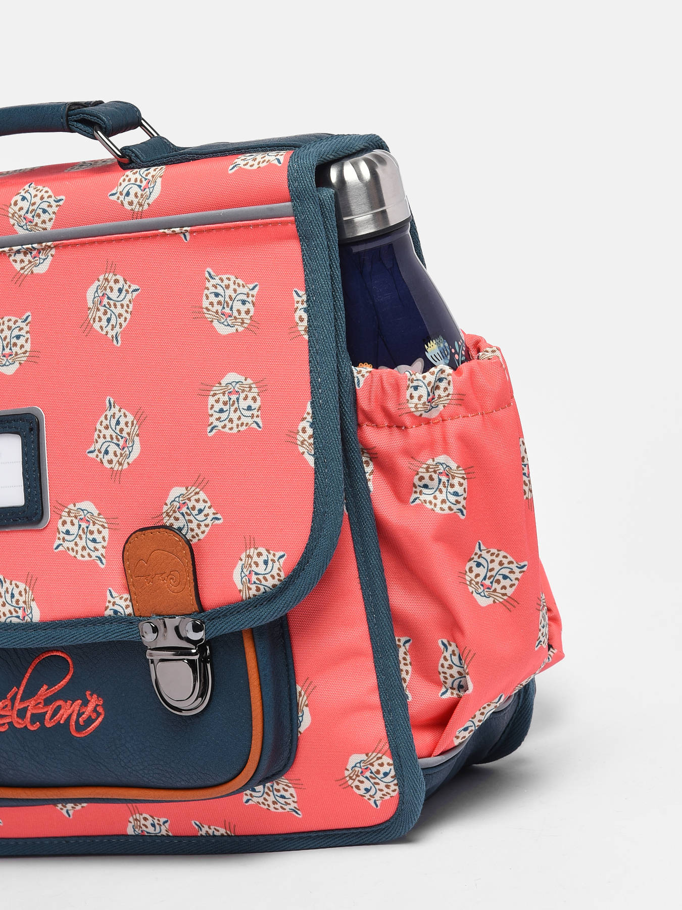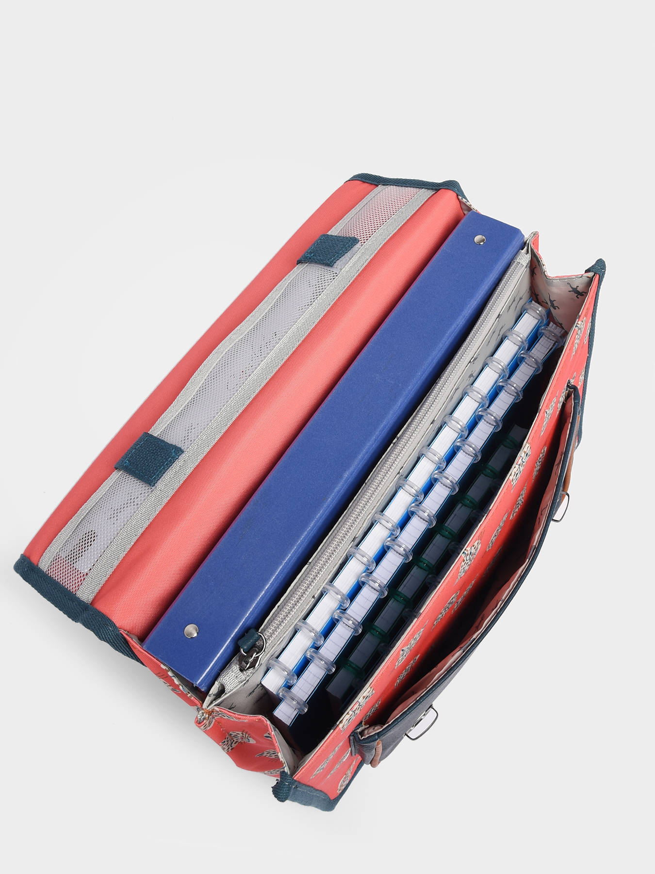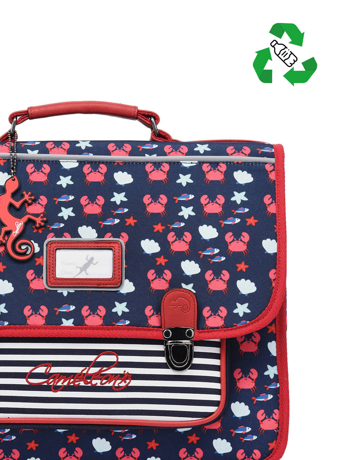35 cm - 13 liters - 0.89 kg ~ We present you this Caméléon two compartment schoolbag for its multiple strong points: its polyester material (naturally water resistant), its modern and timeless lines, its timeless colors, the nicely drawn dog heads and especially for all its other advantages: its resistant handle and straps, its solid closures, its various interior storage compartments and its reflective strips. Finally, you should know that the ergonomics of the Cameleon schoolbags are designed for the well-being of your child.