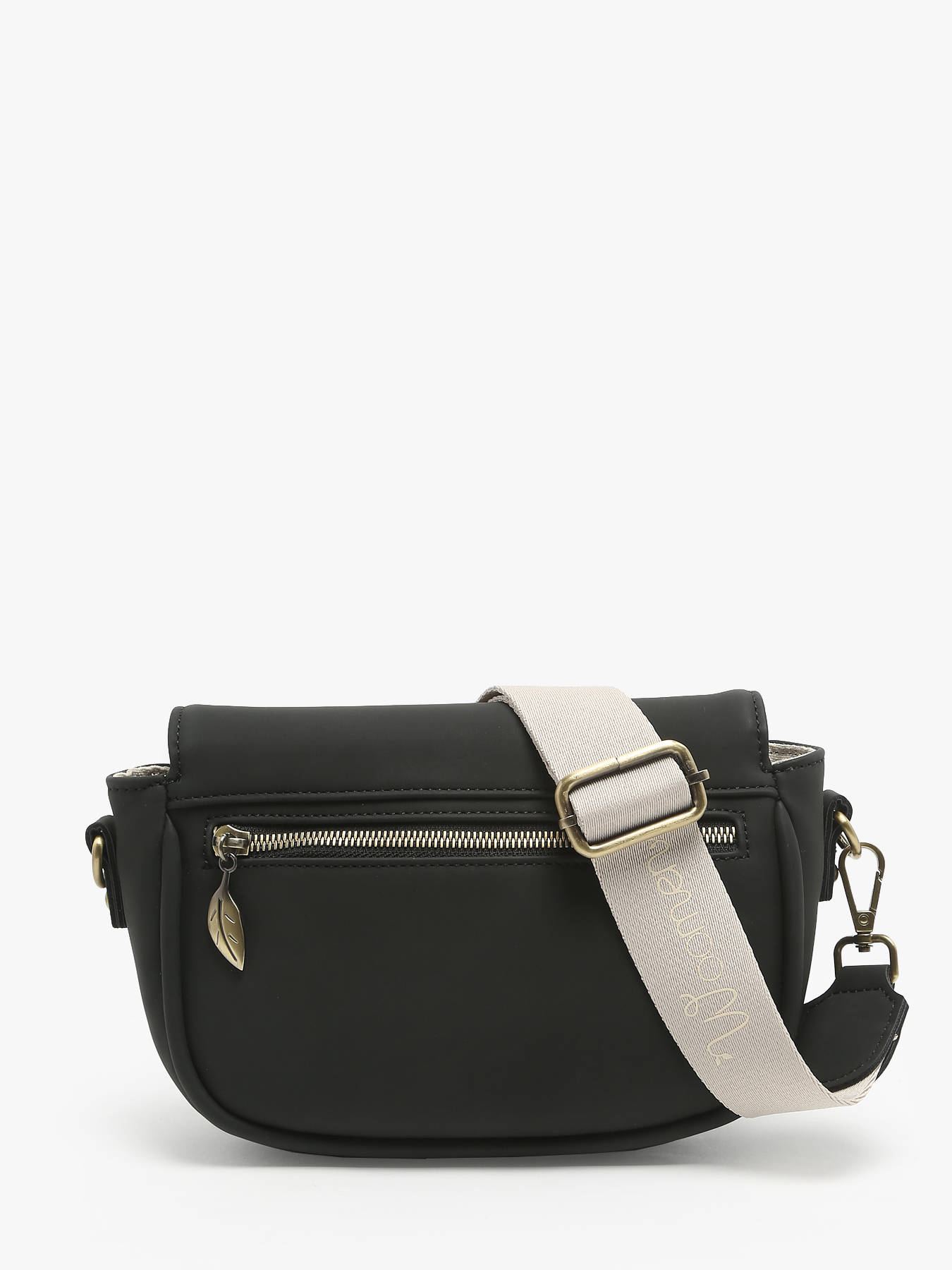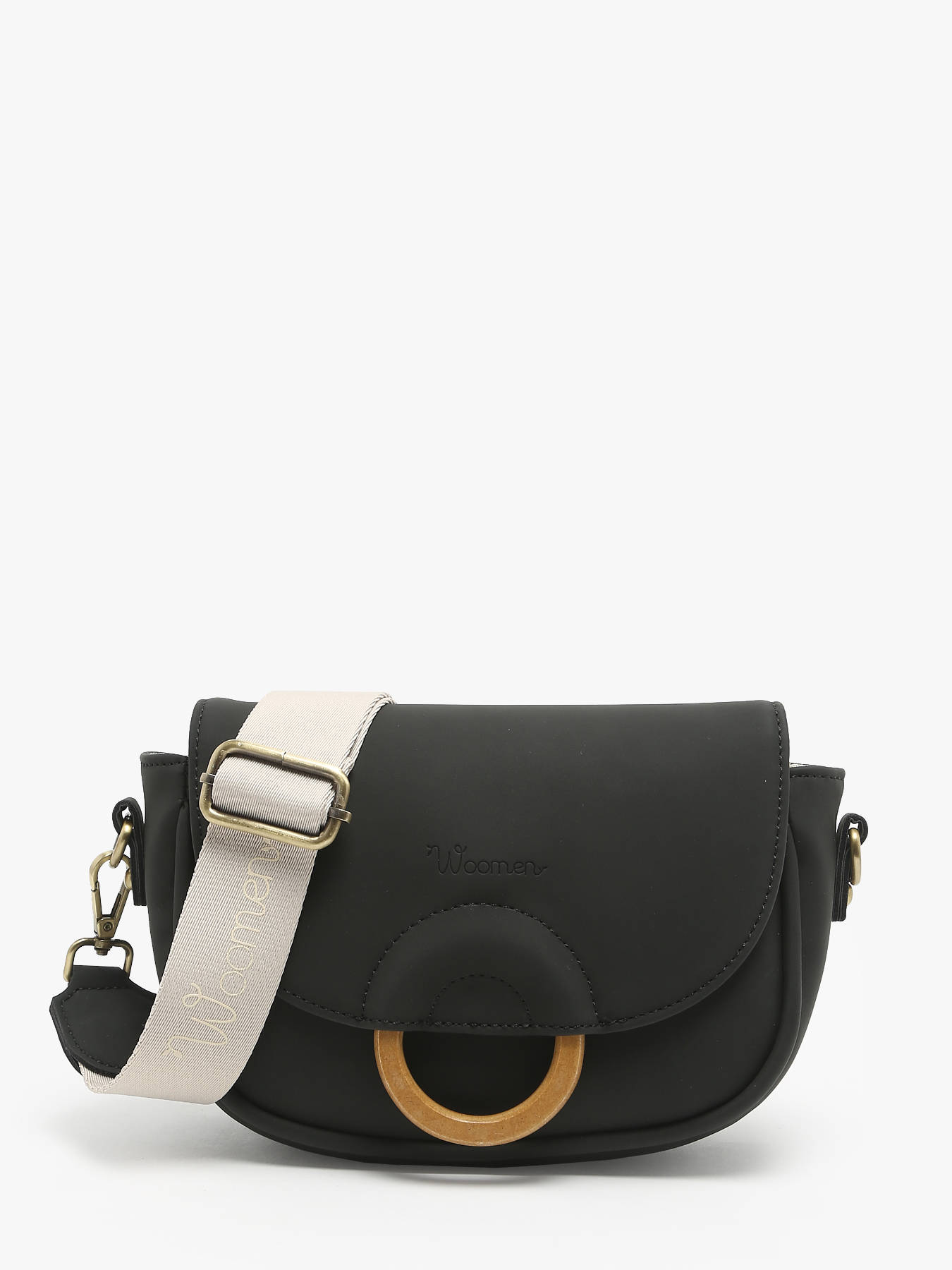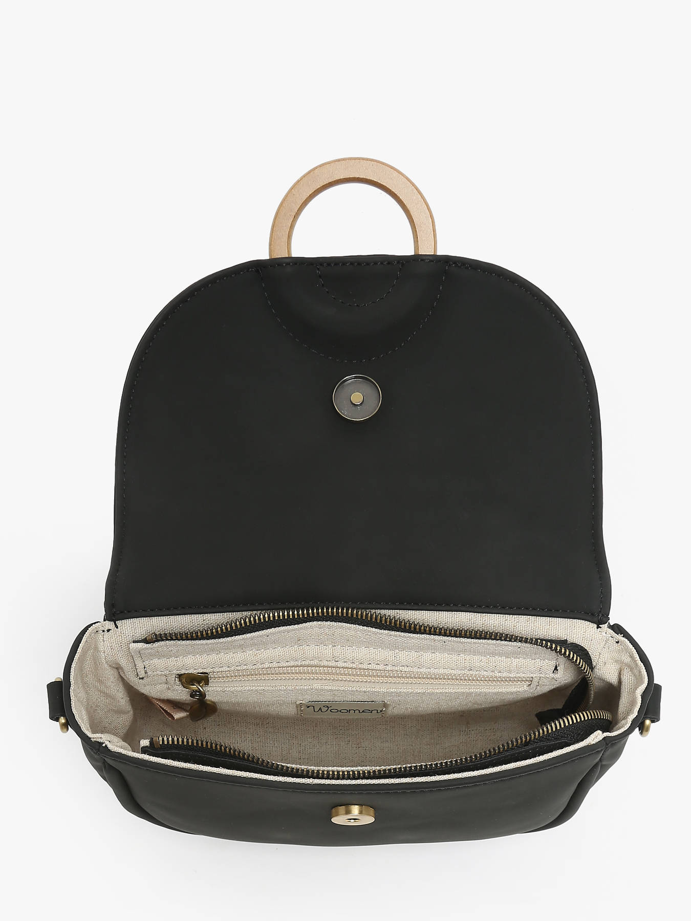 The WOOMEN crossbody bag from the CROCUS line, made of polyurethane composed of 58% recycled materials with a cotton and linen lining, closes with a zip, flap, and magnet. It can be worn high on the shoulder, with a back pocket, a slip pocket, and an interior zip pocket. Its beige Woomen-printed strap and the wooden ring on the flap add an elegant touch.