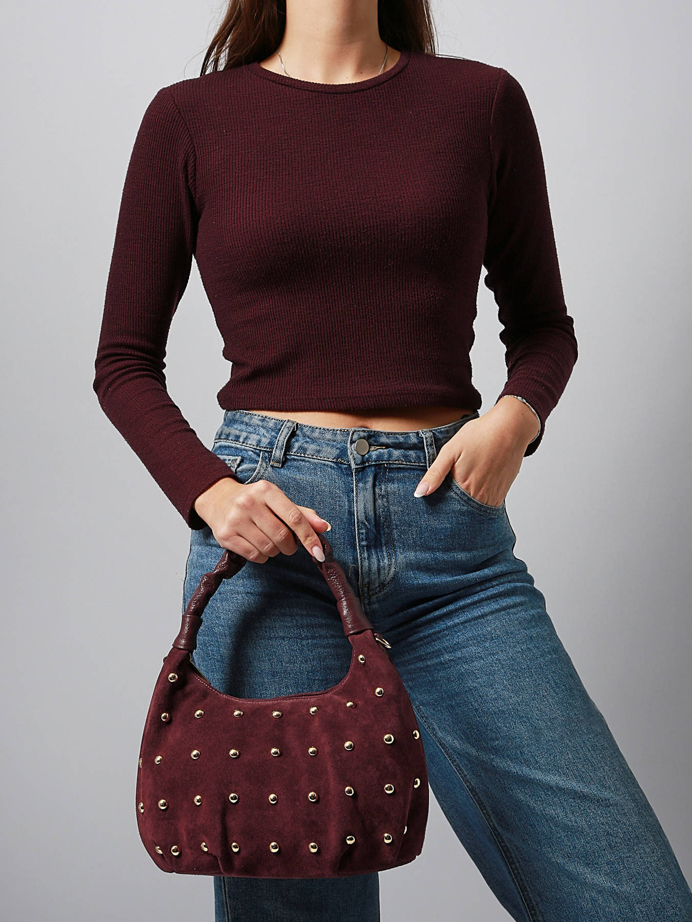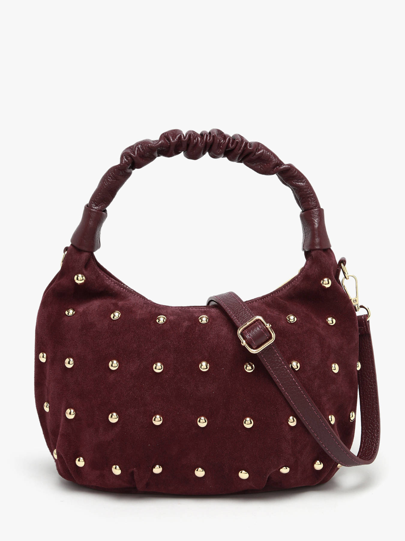 The VELVET STUDS MILANO shoulder bag, crafted from cowhide leather, combines elegance and functionality. Its smooth leather exterior features a zip closure that ensures the security of your belongings. The 16 cm handle height allows for comfortable hand carrying, while the adjustable and removable shoulder strap offers the option to wear it crossbody, according to your preferences and needs. The interior consists of a single compartment, ideal for keeping your essentials organized without bulk. This versatile and chic bag is perfect to complement all your outfits, from everyday wear to dressier occasions, adding a refined and modern touch to your style.