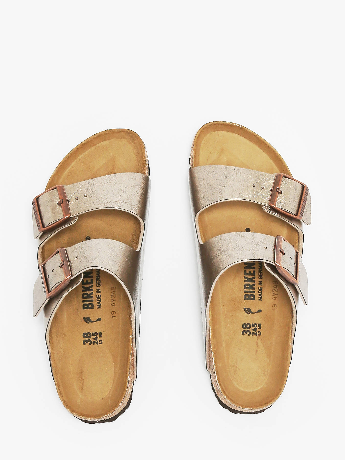 The Arizona mules by BIRKENSTOCK are a timeless classic reimagined with a shimmering touch for an elegant everyday look. This iconic two-strap model maintains its legendary comfort while adopting a refined satin finish. The upper is made from Birko-Flor®, an innovative synthetic material that’s hypoallergenic and highly durable—perfect for daily wear. The anatomically shaped cork-latex footbed offers natural arch support, while the suede leather footbed lining adds softness and breathability. The lightweight EVA outsole provides cushioning and flexibility. Made in Germany, these sandals perfectly blend functionality, style, and premium quality.