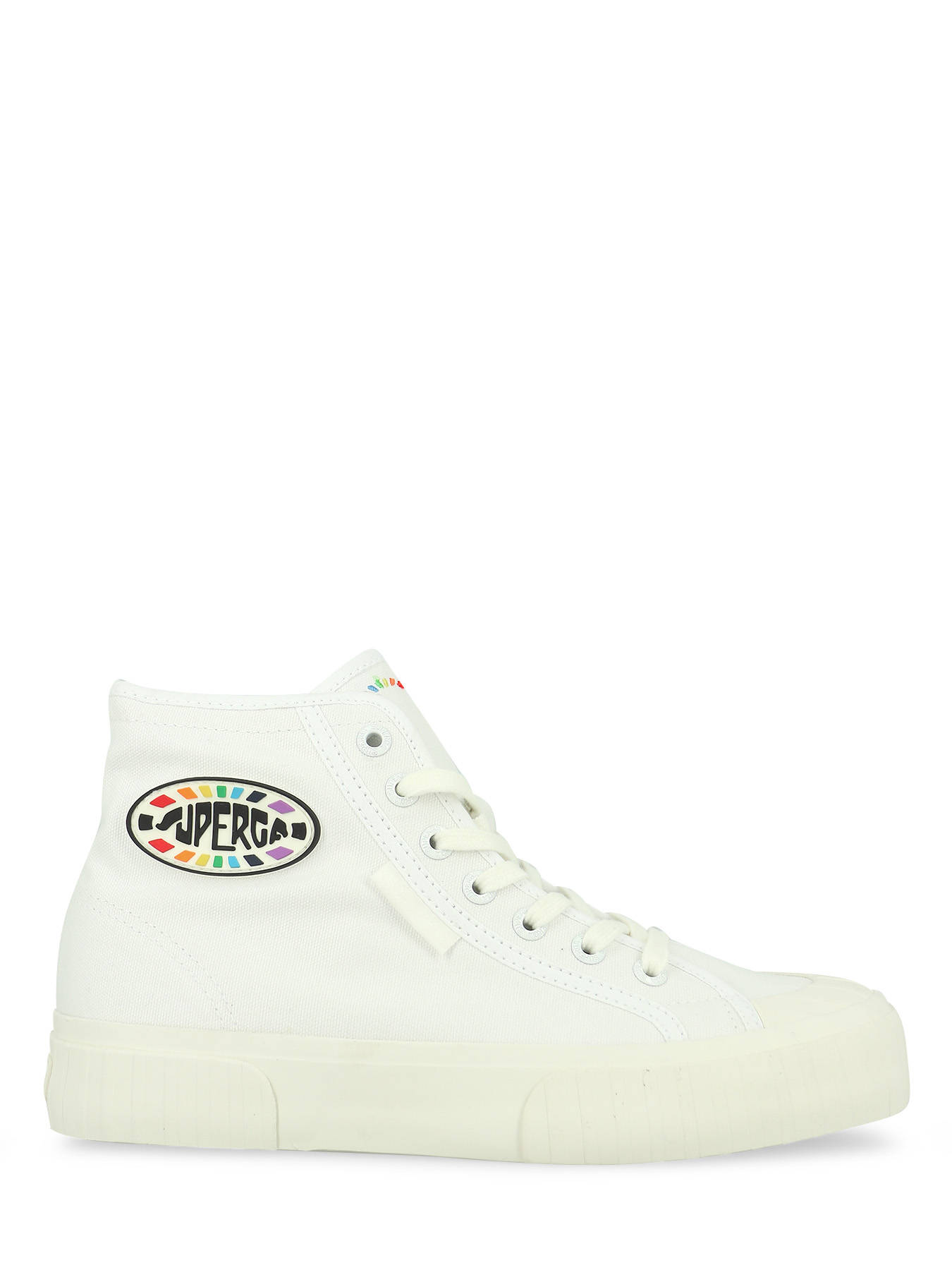 Superga's classic design interprets contemporary style. This mid-calf model combines the classic cotton upper and silicone detailing on the side with a sturdy, supported construction featuring a workwear-inspired striped bumper. A unique trainer for comfort and aesthetics as it supports the fit and signs off any look with casual elegance.