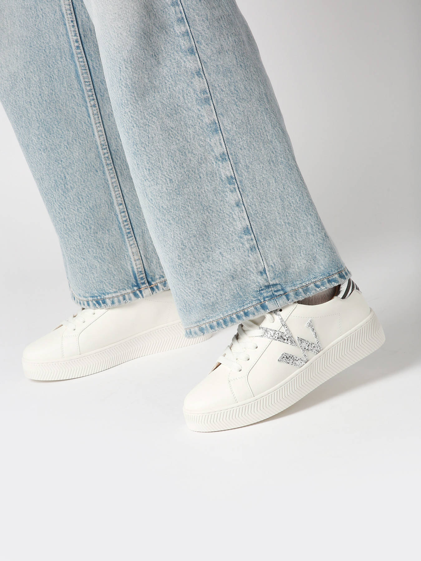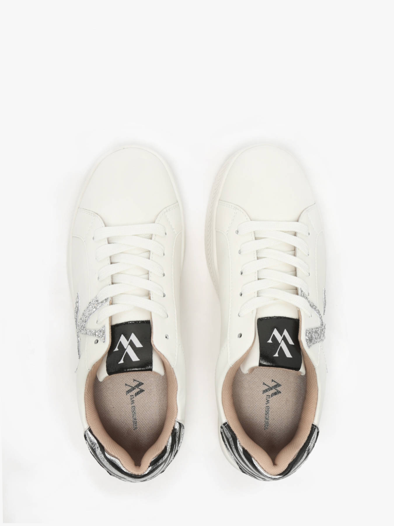 Les baskets monogramme Lou blanc et argent à lacets de Vanessa Wu sont un incontournable de la saison. Leur monogramme en tissu à paillettes argentées, associé à un patch arrière en similicuir texturé argent à imprimé zèbre, créent un look moderne et audacieux. L’imprimé zèbre, dans la tendance actuelle, apporte une touche dynamique et originale à ce modèle. La semelle épaisse blanche à motifs chevrons offre un confort optimal tout en ajoutant du style à vos tenues. Idéales pour un look chic et tendance, ces baskets se distinguent par leur unicité et leur caractère.