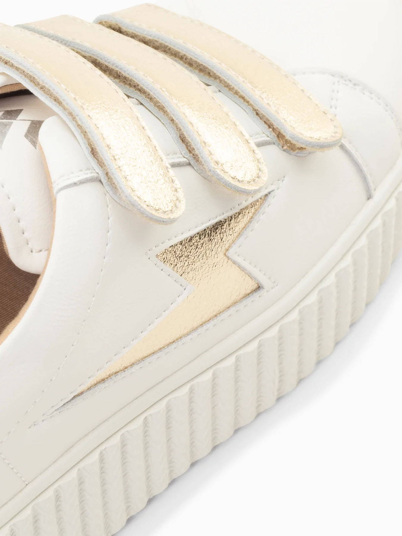 Edisac vous propose ces sneakers Vanessa Wu pour leurs différents avantages : leur matière en similicuir blanc, leur découpe en forme d'éclair et contrefort en similicuir texturé or champagne, leur fermeture à scratchs champagne, leur bout rond et leur semelle creepers blanche. De plus, sachez que leur tige et leur extérieur sont en synthétique, leur doublure et leur semelle intérieure en tissu et leur semelle extérieure en caoutchouc synthétique.